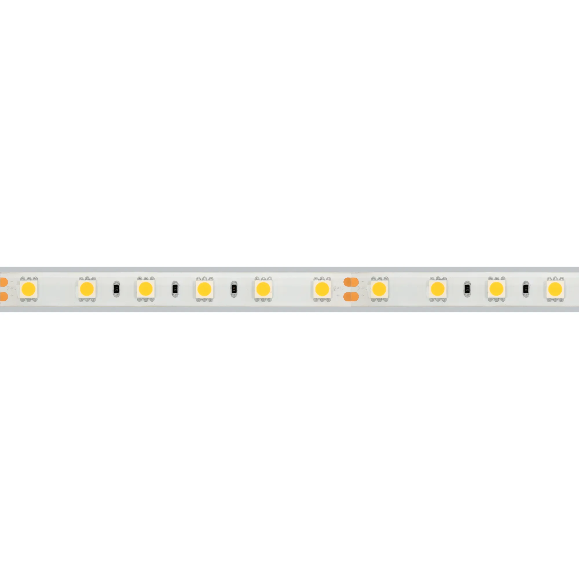 Герметичная гибкая лента (белая матовая силиконовая трубка) IP66, светодиоды smd 5060, 60шт/м (300шт на 5м), белая плата 10мм, скотч 3М. Цвет ТЁПЛЫЙ 2600-2800K. Питание 24V, мощность 14.4 Вт/м (72 Вт на 5м), угол 120°, цветопередача CRI>85. Размеры 5000х13x5мм. Мин.отрезок 100мм, 6 светодиодов. Цена за 1м.