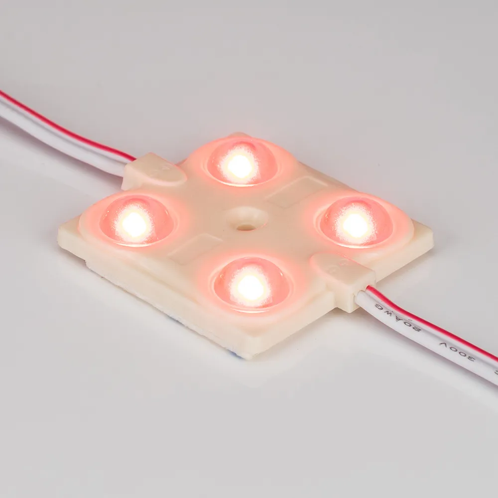 Герметичный светодиодный модуль IP65, КРАСНЫЙ 625 нм, напряжение 12 В, мощность 0.72 Вт, св. поток 22 лм, 4 светодиода SMD 2835, угол 160°. 20 шт на проводе, расстояние между центрами модулей 147 мм, длина провода между модулями 110 мм, рекомендуемая глубина установки 150–250 мм. Размер 37х37х5 мм. Гарантия 3 года.