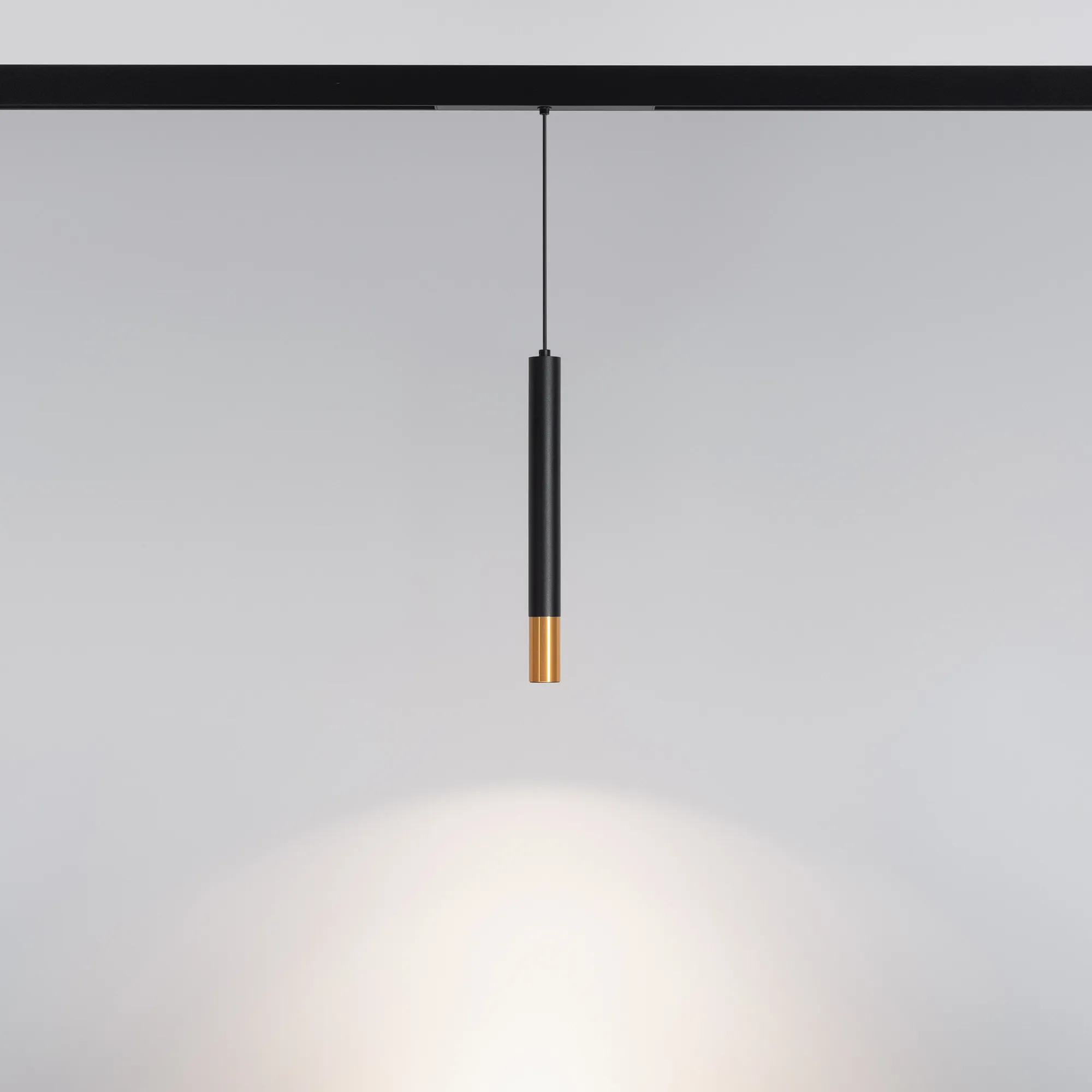 Светильник подвесной для магнитных треков шириной 25мм, 5Вт. Цвет свечения ДНЕВНОЙ 4000K, световой поток 300лм, угол 45°, CRI>90. Корпус цилиндрический, металл, цвет черный с золотой вставкой, IP20. Размер светового модуля 30*300 мм; размер установочного модуля 200*20*25мм; длина подвеса 1400 мм. Входное напряжение DC24V, мощность 5Вт. Драйвер DС24V/AC230V поставляется отдельно. Диммируется только с 026407, 027633. Подвес регулируется.