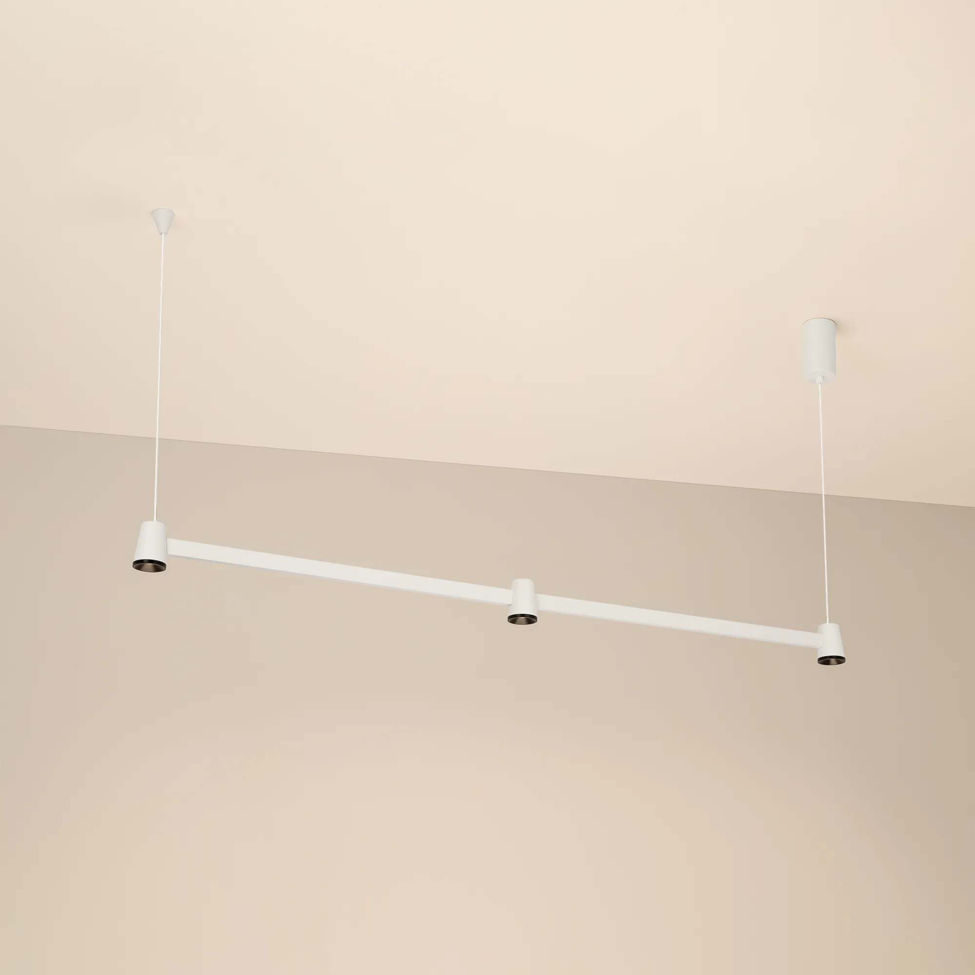 Подвесной светильник. Мощность 16 Вт, св. поток 1010 лм, 63 лм/Вт, теплый 3000 K, CRI>90, угол 35°, напряжение питания 230 В. Белый корпус из алюминия, степень защиты IP20. Размер: длина 1039 мм, ширина 40 мм, высота 55 мм, размер чаши: диаметр 50 мм, высота 90 мм. Монтаж подвесной, длина подвеса 1300 мм. Драйвер 27-38 В, 500 мА, пульсация <1%.