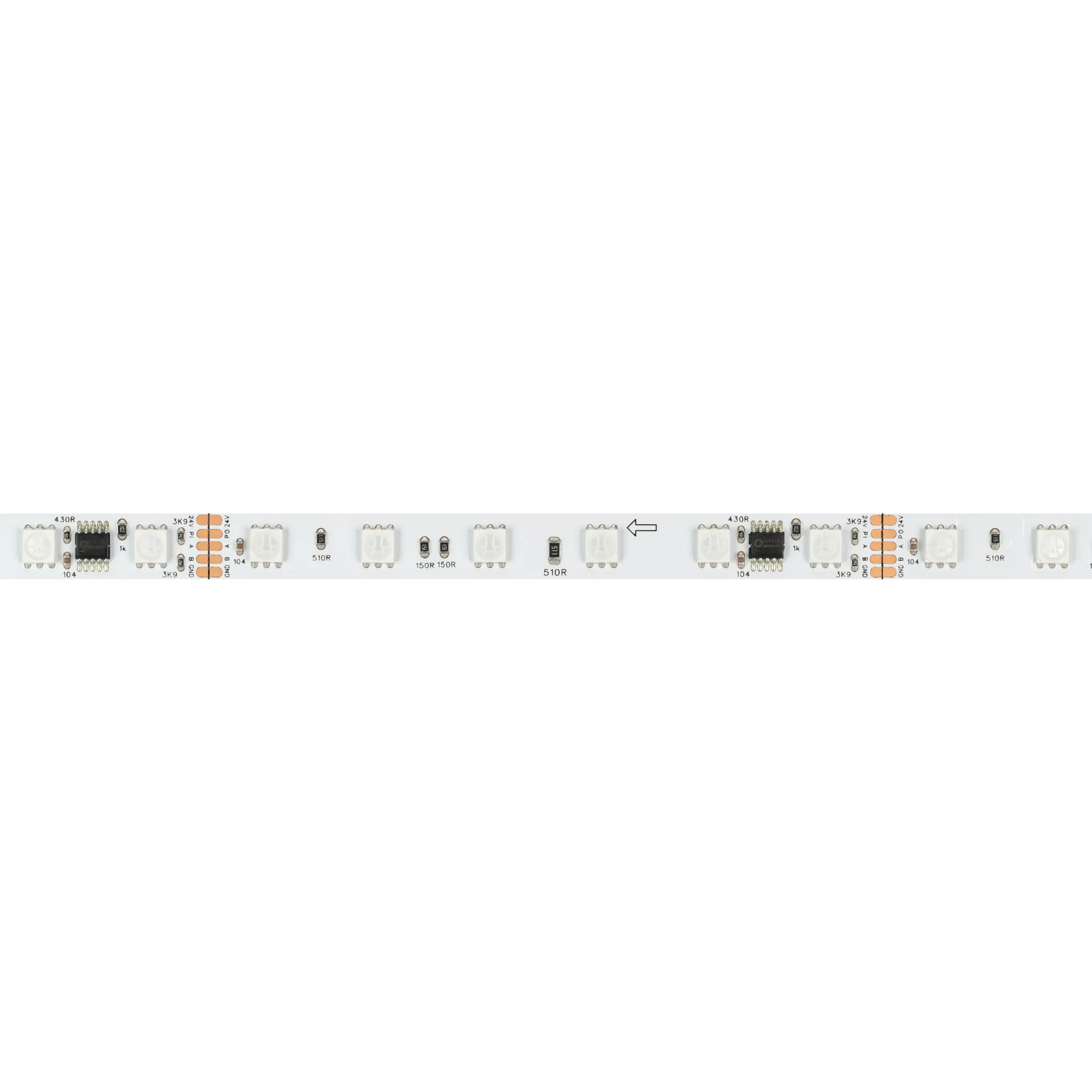 Светодиодная лента DMX серии B60 с микросхемой GS8526. Светодиоды SMD 5060, 60 шт/м, 10 pixels на 1 м (50 pixels на 5 м), 1 pixel = 6 светодиодов, белая плата шириной 10 мм, скотч 3М. Цвет RGB, угол 120°. Питание 24 В, мощность 14 Вт/м (70 Вт на 5 м). Размеры 5000x10x1.8 мм. Мин. отрезок 100 мм, 6 светодиодов. Цена за 1 м.
