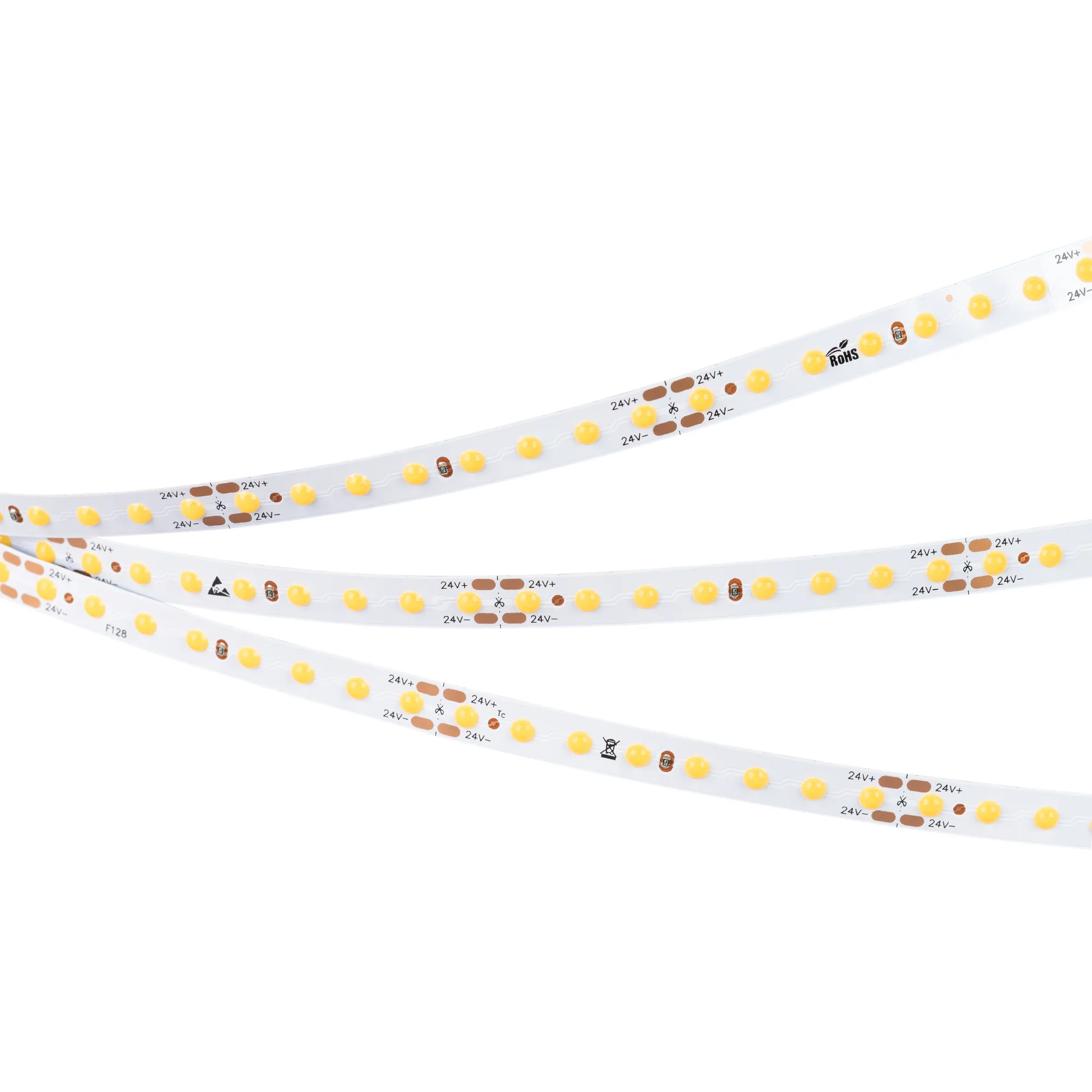 Светодиодная лента DOT с видимой световой точкой серии X128. Светодиоды CSP, 128 шт/м, белая плата шириной 8 мм, скотч 3M. Цвет ТЕПЛЫЙ 3000K, индекс цветопередачи CRI>80, угол 145°. Питание 24 В, мощность 11 Вт/м (55 Вт на 5 м). Размеры 5000х8х1.2 мм. Мин. отрезок 62.5 мм, 8 светодиодов. Цена за 1 м.