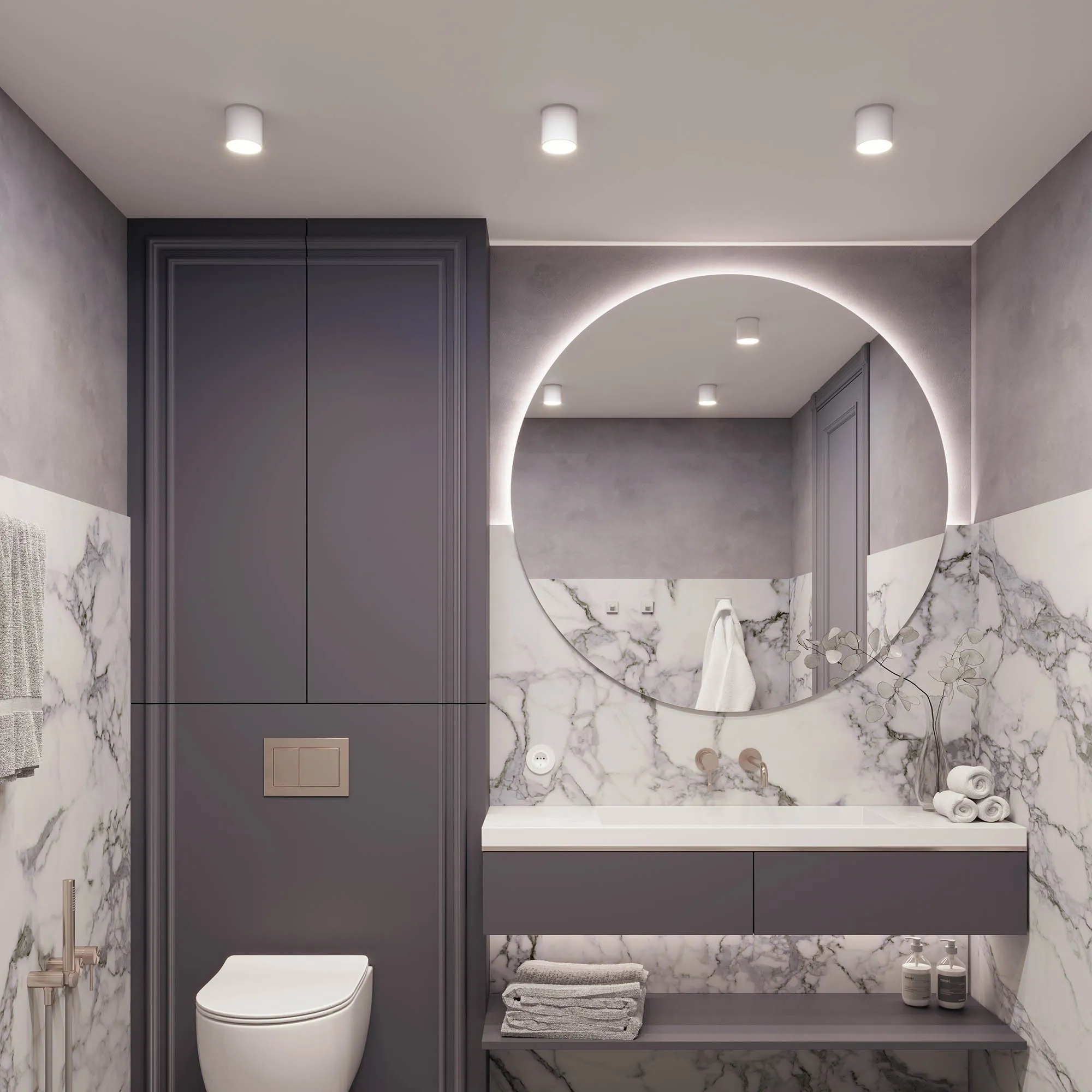 Накладной интерьерный светильник. Мощность 7 Вт, св. поток 290 лм, 41 лм/Вт, тёплый 3000 K, CRI>90, угол 110°, напряжение питания 230 В. Белый круглый корпус из алюминия, степень защиты IP54. Размер: диаметр 75 мм, высота 70 мм. Монтаж накладной. Драйвер 16-24 В, 250 мА, пульсация <2%.