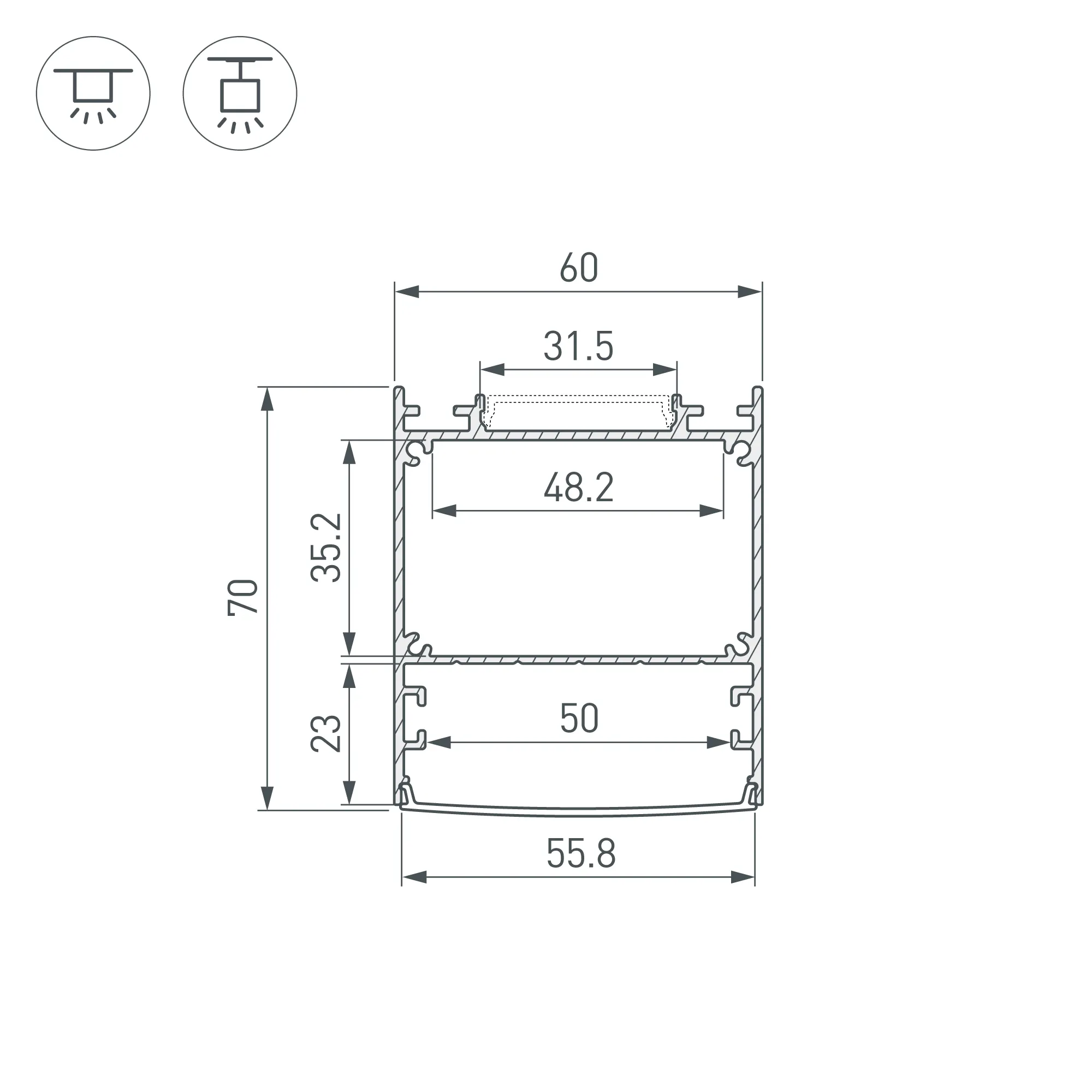 Алюминиевый анодированный профиль для светодиодных лент и линеек. Цвет - черный. Габаритные размеры (L×W×H): 3000x60x70 мм. Ширина площадки ленты направленного света 50 мм, отраженного света - 30 мм. Отсек для БП 48,2х35,2 мм. Экраны, заглушки и другие аксессуары приобретаются отдельно. Цена за 1 метр.