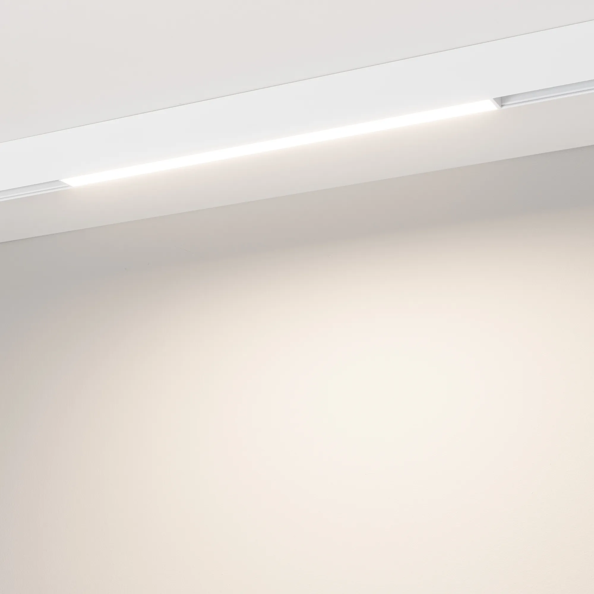 Светильник для магнитных треков MAG-ORIENT шириной 26 мм с управлением DALI. Мощность 16 Вт, св. поток 1360 лм, 85 лм/Вт, дневной 4000 K, CRI>90, угол 100°, напряжение питания 48 В. Белый прямоугольный корпус из металл, экран поликарбонат, степень защиты IP20. Размер: длина 462 мм, ширина 22 мм, высота 42 мм. Монтаж на трек MAG-ORIENT. Пульсация <1%.