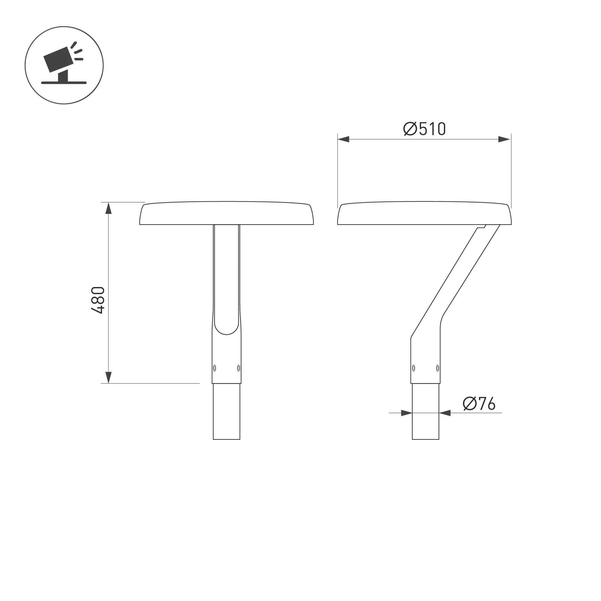Венчающий светодиодный светильник. Мощность 50 Вт, св. поток 7100 лм, 141 лм/Вт, тёплый 3000 K, CRI>80, угол 145x40°, напряжение питания 230 В. Черный корпус из алюминия, экран закаленное стекло, степень защиты IP65. Размер: диаметр 510 мм, высота 480 мм. Монтаж на вертикальную опору диаметром 76 мм.